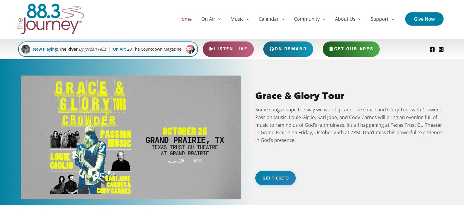 KJRN in Keene, TX serves southern DFW metroplex and North Central Texas. Rich Hooper and his team rely on Radioservers for full-time webmaster services and as such, 88.3 The Journey has unlimited access to Radioservers software and staff. We redesign their website every 3 years or as needed, provide unlimited graphics included branded Bible verses for daily posts, featured post images, advertising banners for supporters and more.